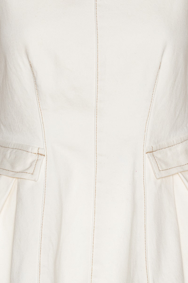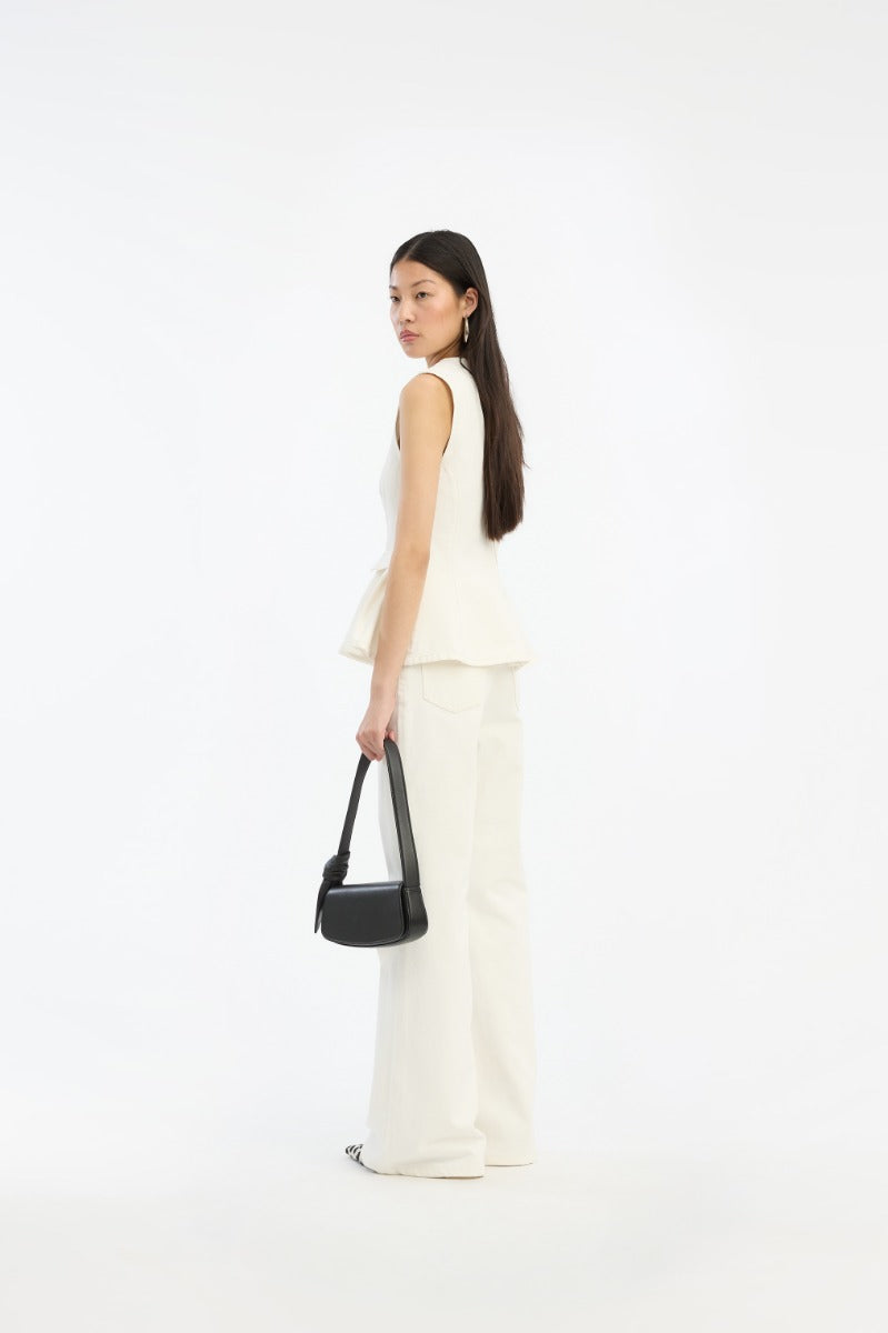 - Peplum Denim Top White Denim is a sleeveless top in white denim with a round neckline