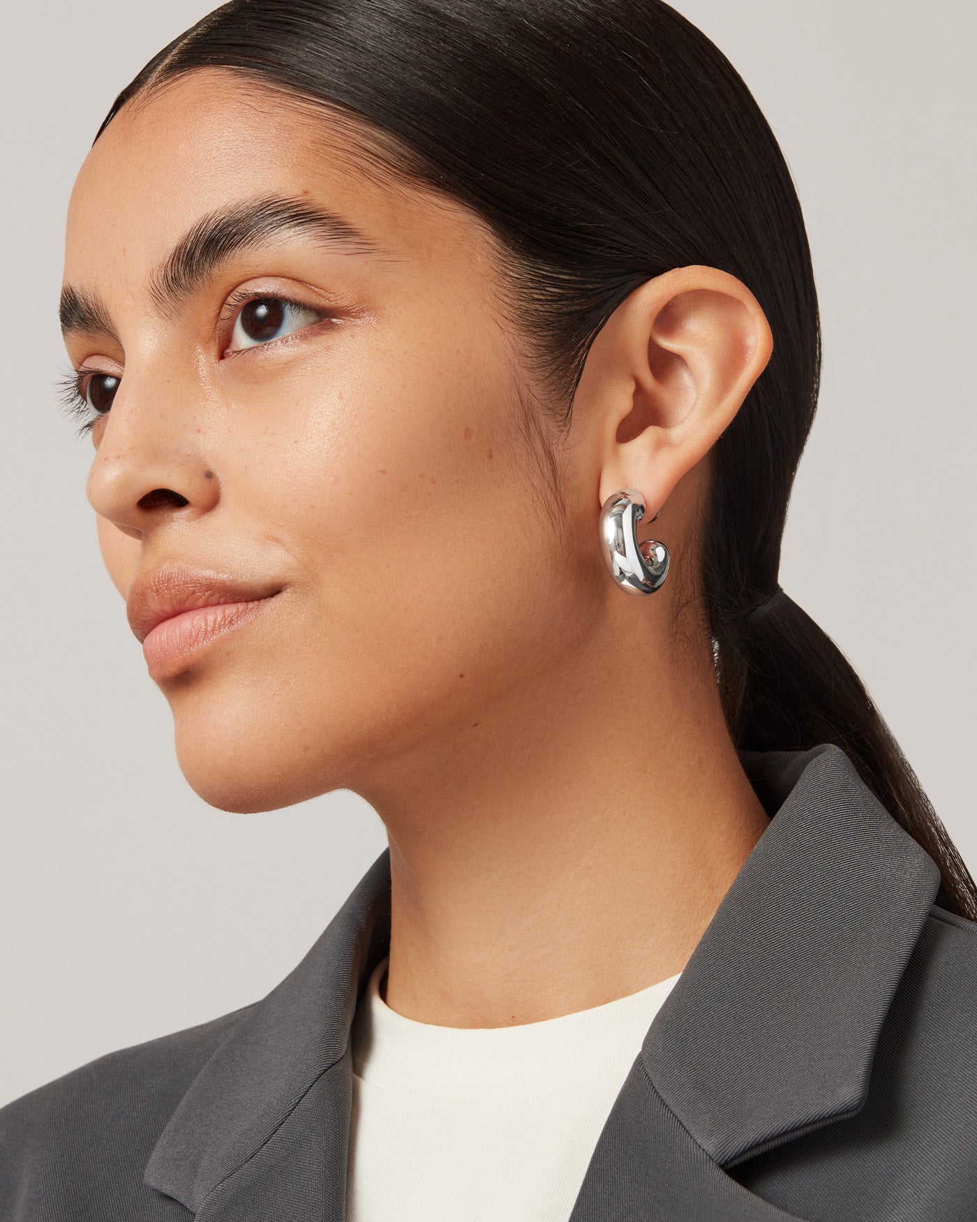 - Large hoop earrings with tubular shape, rounded ends and a custom JB ball