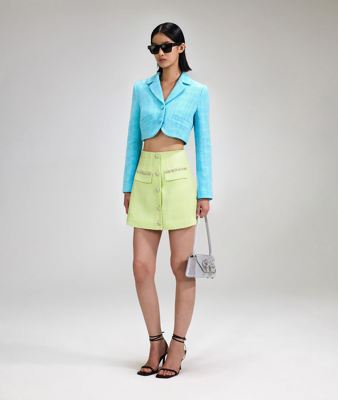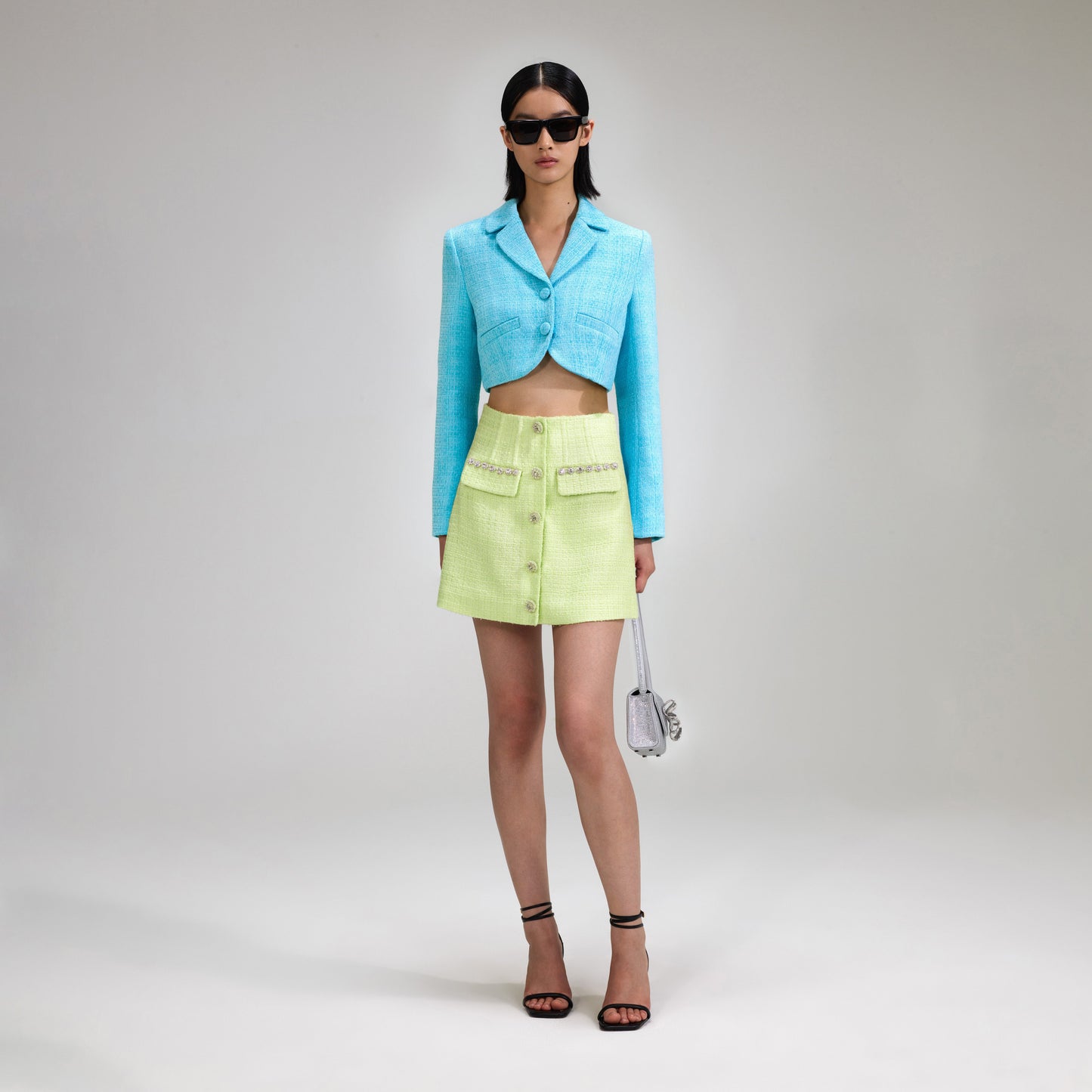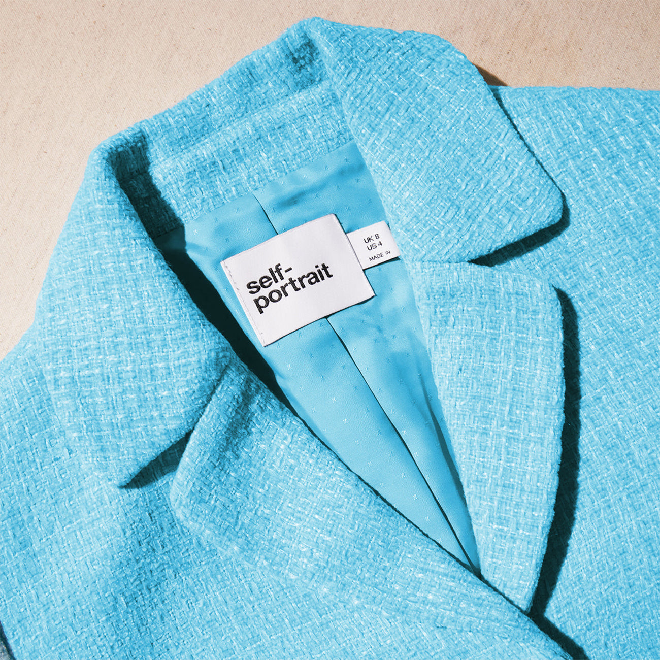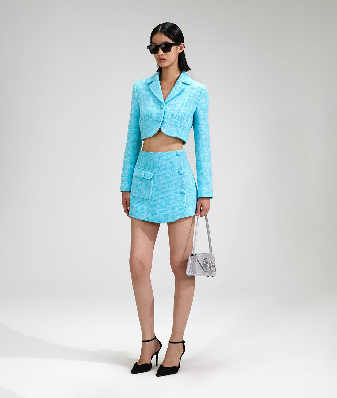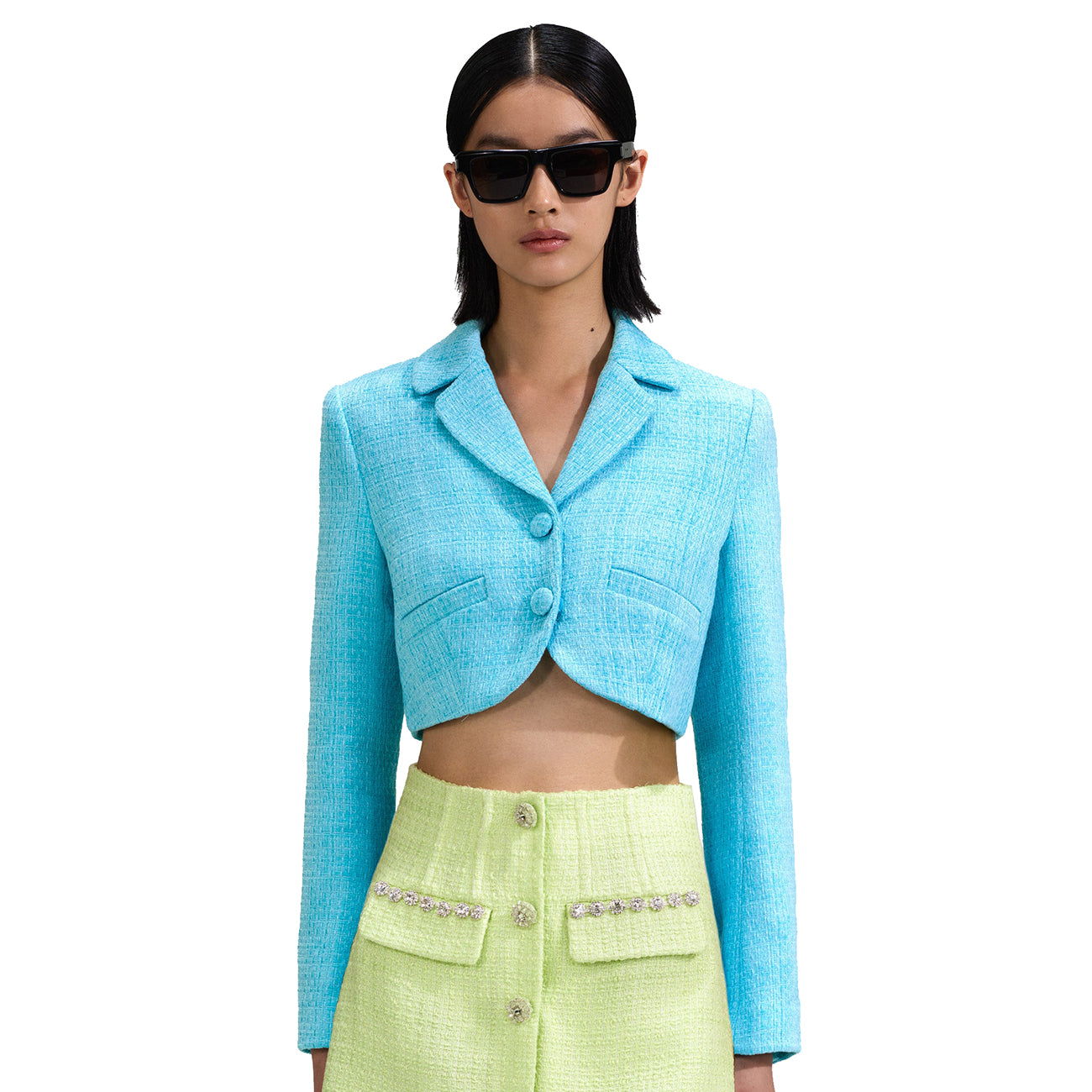 - Vintage-inspired accents meet modern proportions in this jacket, which is cut from sky blue bouclé for its soft structure and rich feel