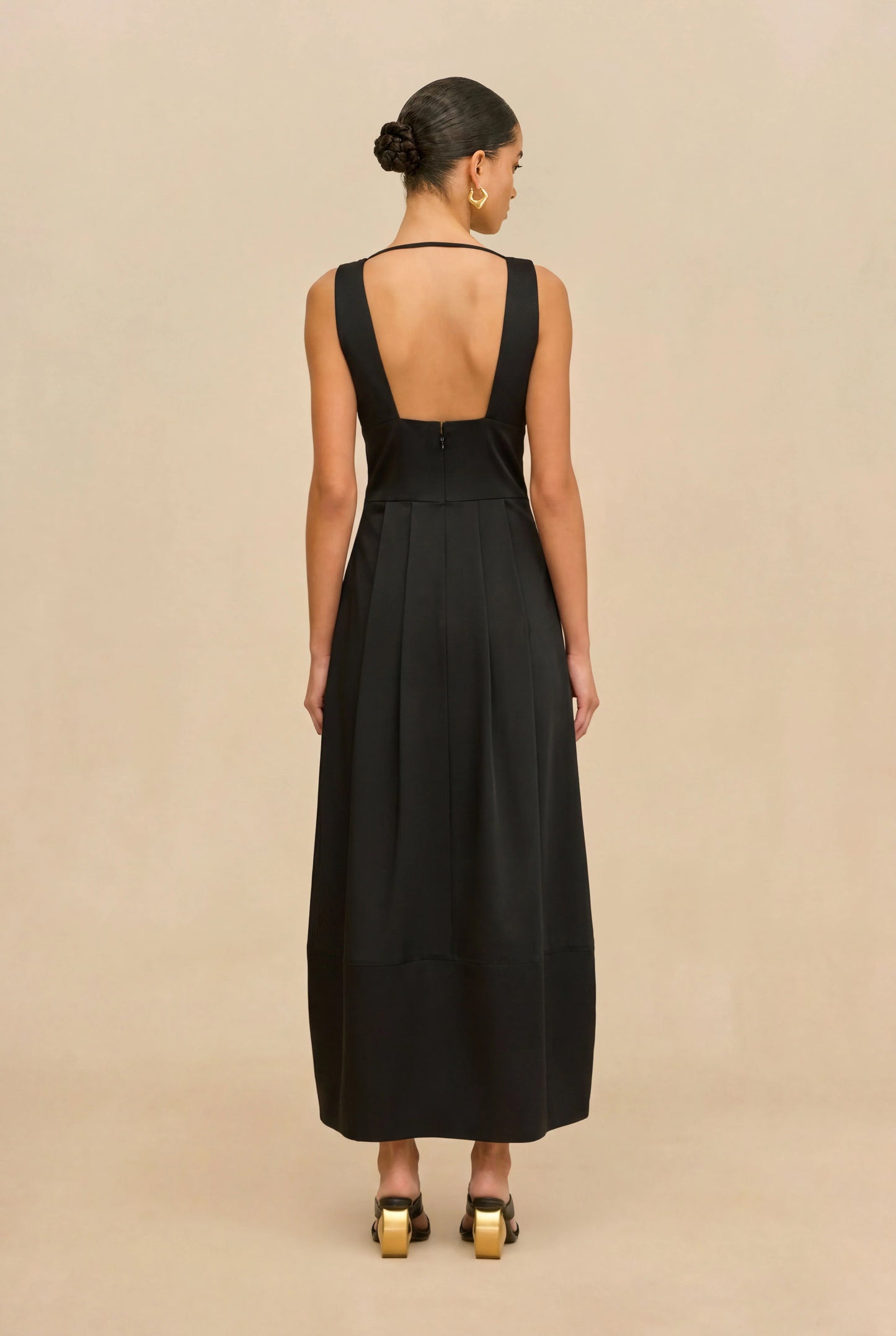 - An effortless poplin midi dress featuring a plunging neckline and golden hardware at the bust
