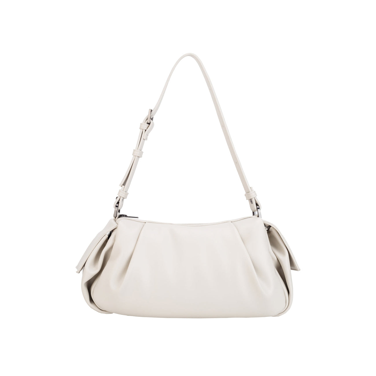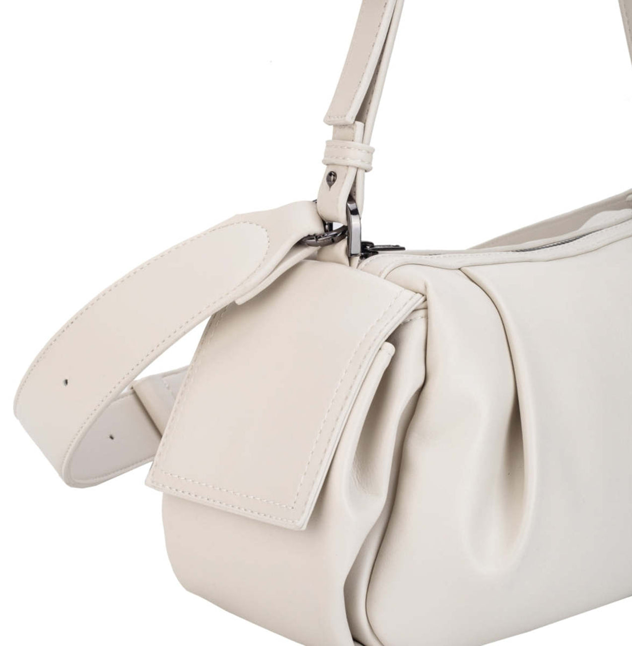 The bag can be worn as crossbody with the attachable, adjustable strap and features one inner zipper pocket as well as two outer pockets with flaps that close with snap buttons.