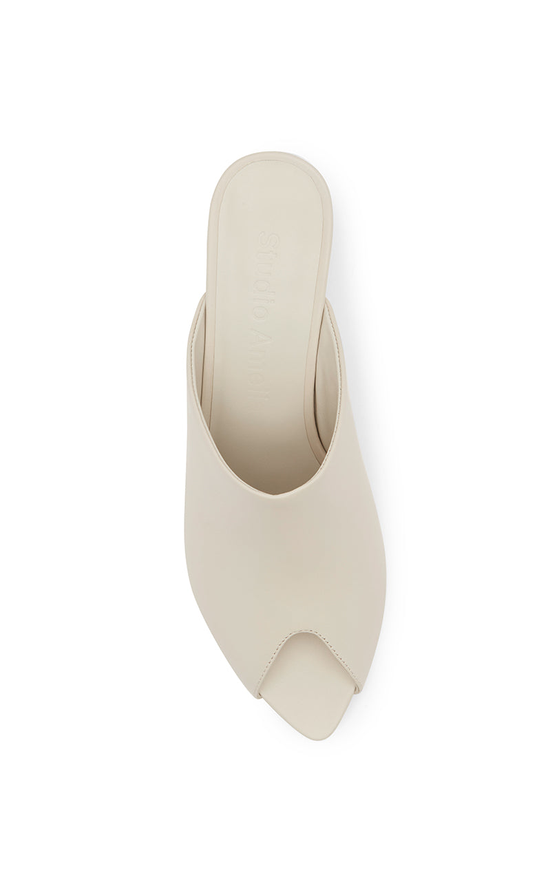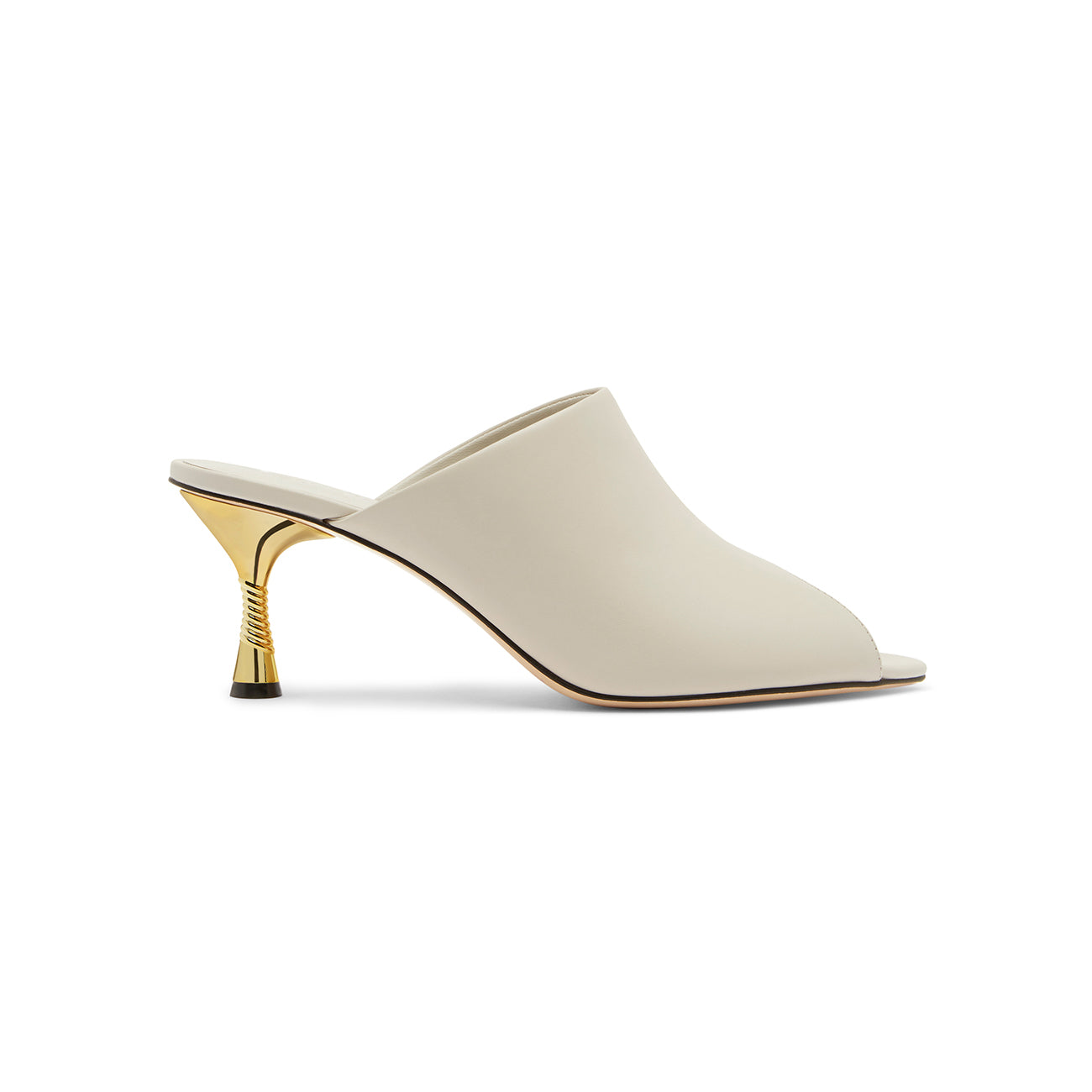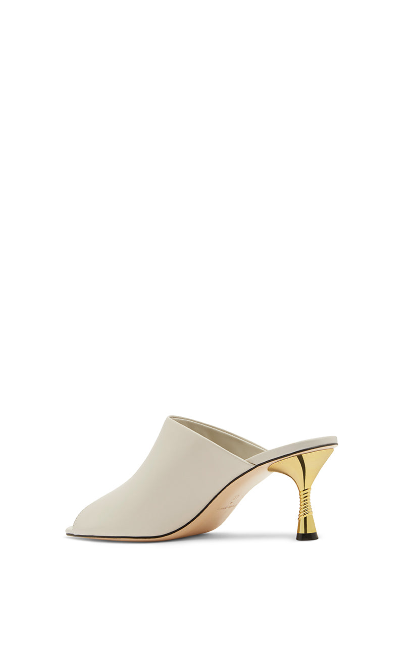 - The signature twisted gold-plated Helix heel adds a striking, architectural element, elevating the mule with elegance and craftsmanship. Made from 100% chrome-free calf nappa leather, it's designed for a slightly generous fit—ideal for standard sizing, though those with slimmer feet may consider sizing down. For longevity, a leather protector free of harmful oils is recommended.