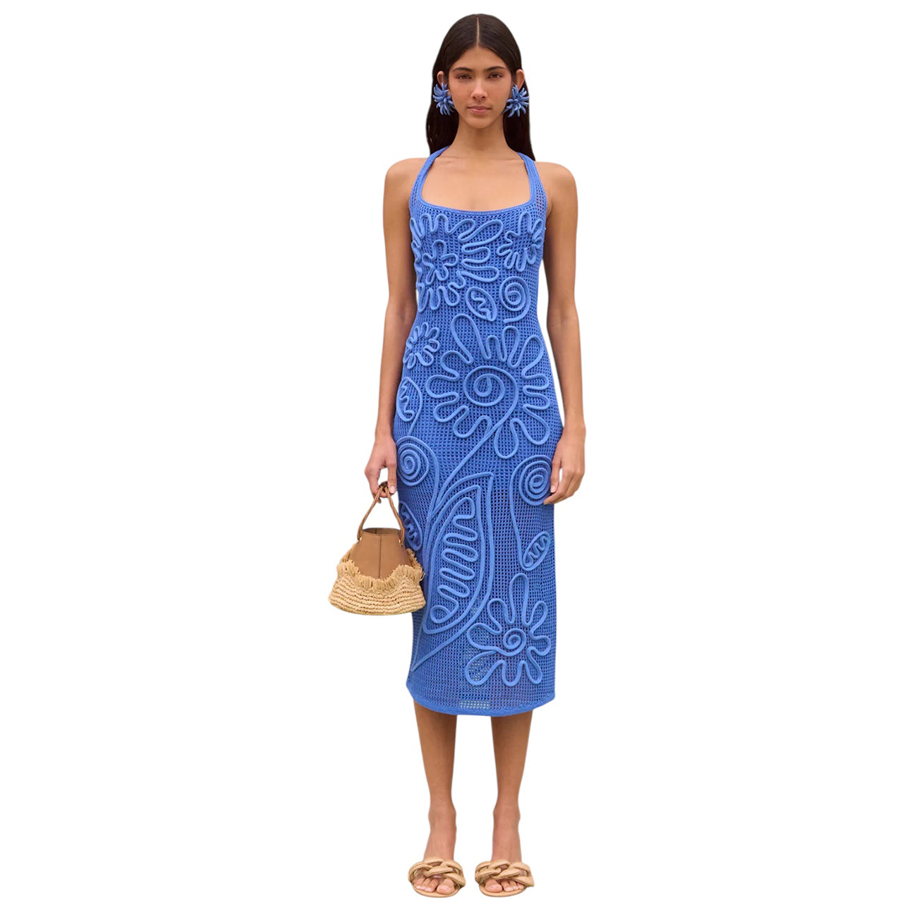 - A sleeveless midi dress with a netting body and cord detail floral overlay.